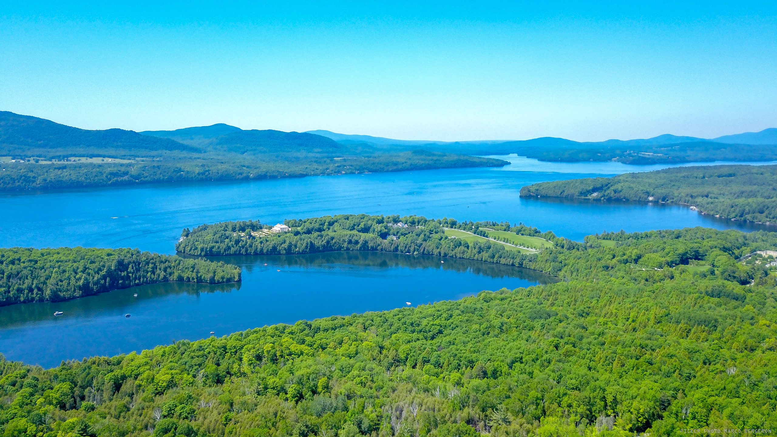 Le Domaine Belmere est situé sur la pointe du même nom, quelques kilomètres à peine au sud du village de Georgeville. On qualifie cette propriété de «petit Versailles» avec une luxueuse maison principale, des résidences secondaires, des fontaines et de vastes jardins.