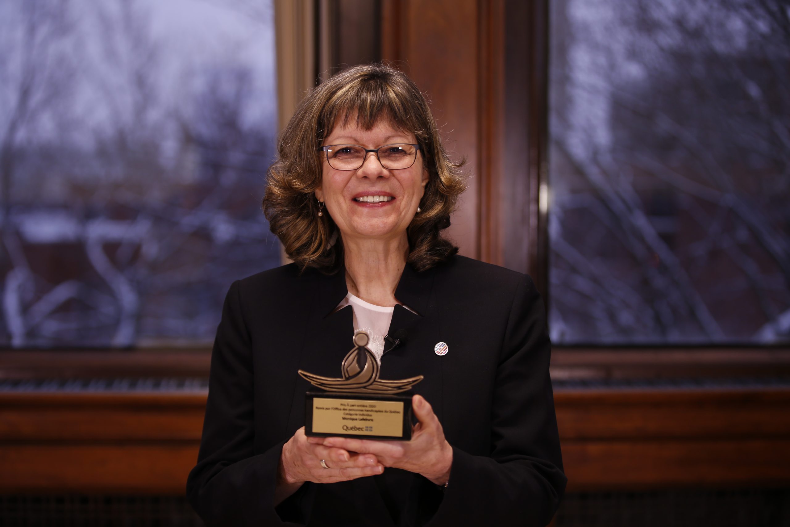 Monique Lefebvre figure parmi les six lauréats provinciaux. Elle a été récompensée dans la catégorie «Individus». En plus d’une bourse de 10 000 $, elle a reçu un trophée en bronze pour souligner son engagement à l’égard de la participation sociale des personnes handicapées.