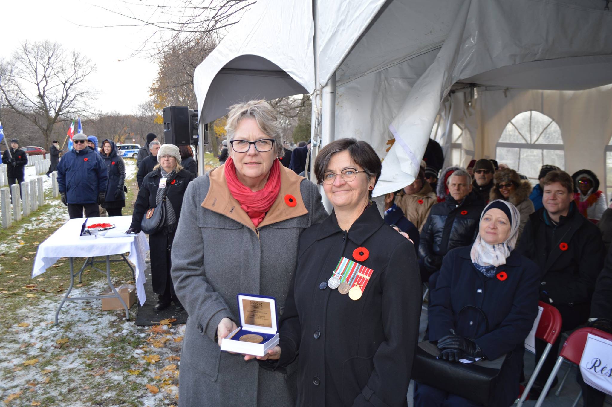 HOMMAGE. La Magogoise Linda Chouinard a reçu la Médaille de l’Assemblée nationale lors du jour du Souvenir dimanche dernier (11 novembre), une cérémonie commémorant également le centenaire de la Première Guerre mondiale et les 25 ans de la Guerre de Bosnie-Herzégovine. Cette ancienne militaire de l’Armée canadienne pendant 22 ans a reçu cet hommage des mains de la ministre déléguée du Transport et ministre responsable de la Métropole et de la région de Montréal, Chantal Rouleau. Sept autres anciens combattants ont également reçu une médaille lors de cette cérémonie se déroulant au Cimetière Notre-Dame-des-Neiges de Montréal. Vivant avec un stress post-traumatique depuis quelques années, Linda Chouinard voit cette reconnaissance comme un baume sur une plaie. «J’ai été vraiment sonnée et surprise de recevoir cette médaille, mais elle me fait très plaisir, avoue-t-elle. C’est comme une reconnaissance de notre engagement militaire, parfois très méconnu du public.» Elle a cependant dû prendre son courage à deux mains pour assister à cette célébration, surtout qu’elle se sentait incapable de participer aux activités du jour du Souvenir depuis une dizaine d’années. Ayant vécu six mois d’enfer en Bosnie à soigner des militaires sévèrement blessés, elle se contentait de regarder ces commémorations à la télévision en pleurant. Aujourd’hui, elle remonte la pente en vivant un jour à la fois et en partageant son expérience. Son témoignage a été notamment publié dans Le Reflet du Lac en mai 2018, ainsi que dans un livre intitulé «Mes tempêtes intérieures», également paru en 2018. Son récit accompagnait ceux de personnalités comme Jean-Nicolas Verreault, Florence K, Jean-Marie Lapointe et Marianne St-Gelais. Afin de peaufiner son plan de guérison, Linda Chouinard a également participé à une symbolique randonnée de 600 km en vélo en juin dernier dans les Balkans. L’objectif était de commémorer les 100 ans de la fin de la Première Guerre mondiale et les 25 ans du début de la mission canadienne à Sarajevo. Pour boucler la boucle, elle accompagnera un groupe de cyclistes en 2019 pour rouler 600 km en Normandie, cette fois pour commémorer le 75e anniversaire du désormais célèbre débarquement du même nom.