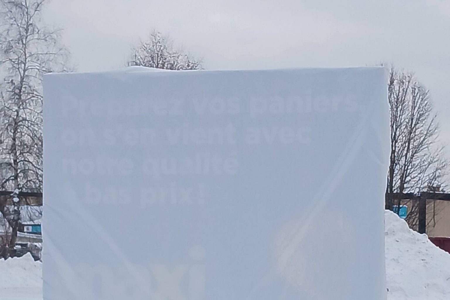 Lundi matin, une nouvelle pancarte a été installée aux abords du complexe industriel désaffecté. Celle-ci etait toutefois recouverte d’une pellicule pour en cacher le contenu. En y prêtant attention, on pouvait tout de même distinguer le logo jaune de la compagnie, avec le message qui suit: “Préparez vos paniers. On s’en vient avec notre qualité à bas prix.”
