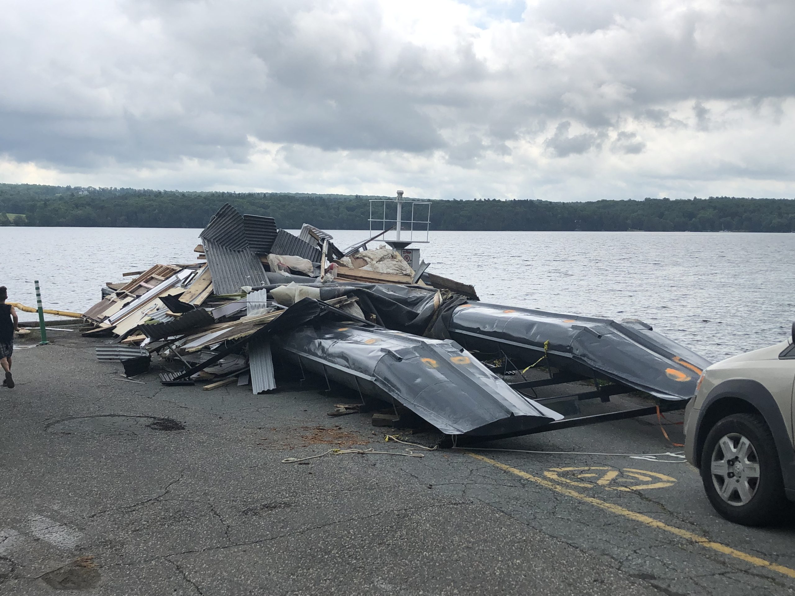 Chaviré et flottant sur le lac Memphrémagog pendant plus de deux semaines, un immense ponton a finalement été retiré des eaux au quai de Knowlton Landing à Austin, lundi dernier. (15 juillet).