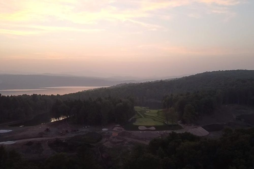 Des images aériennes dévoilent au moins une allée de golf, des trappes de sable et des sections d’herbes plus longues. Ces travaux sont effectués à travers une forêt dense à proximité du lac Memphrémagog. Tout autour de ces aménagements figure une grande zone déboisée en plein chantier, avec la présence de machinerie lourde. Un vaste lac artificiel compose également le nouveau paysage.