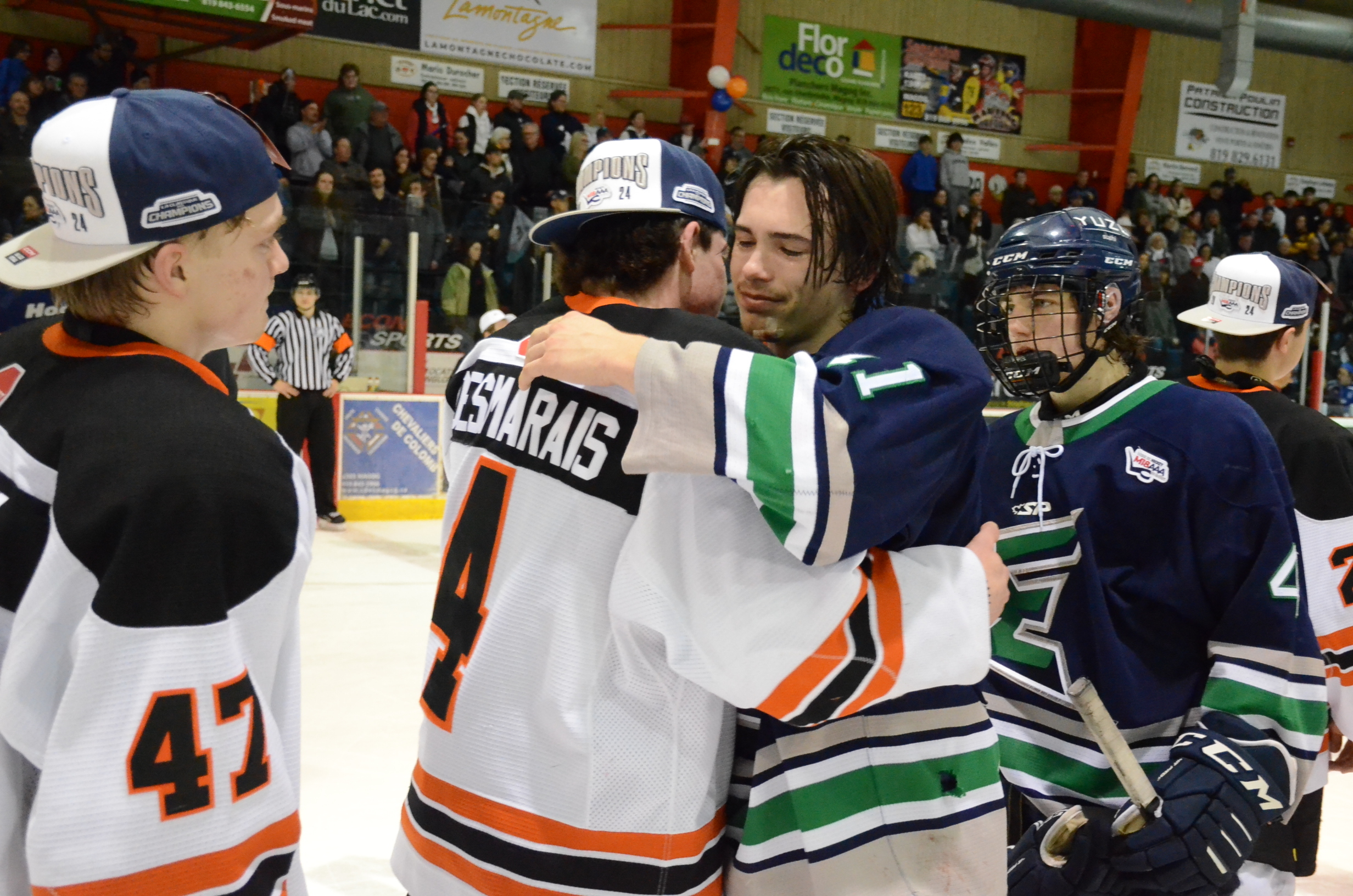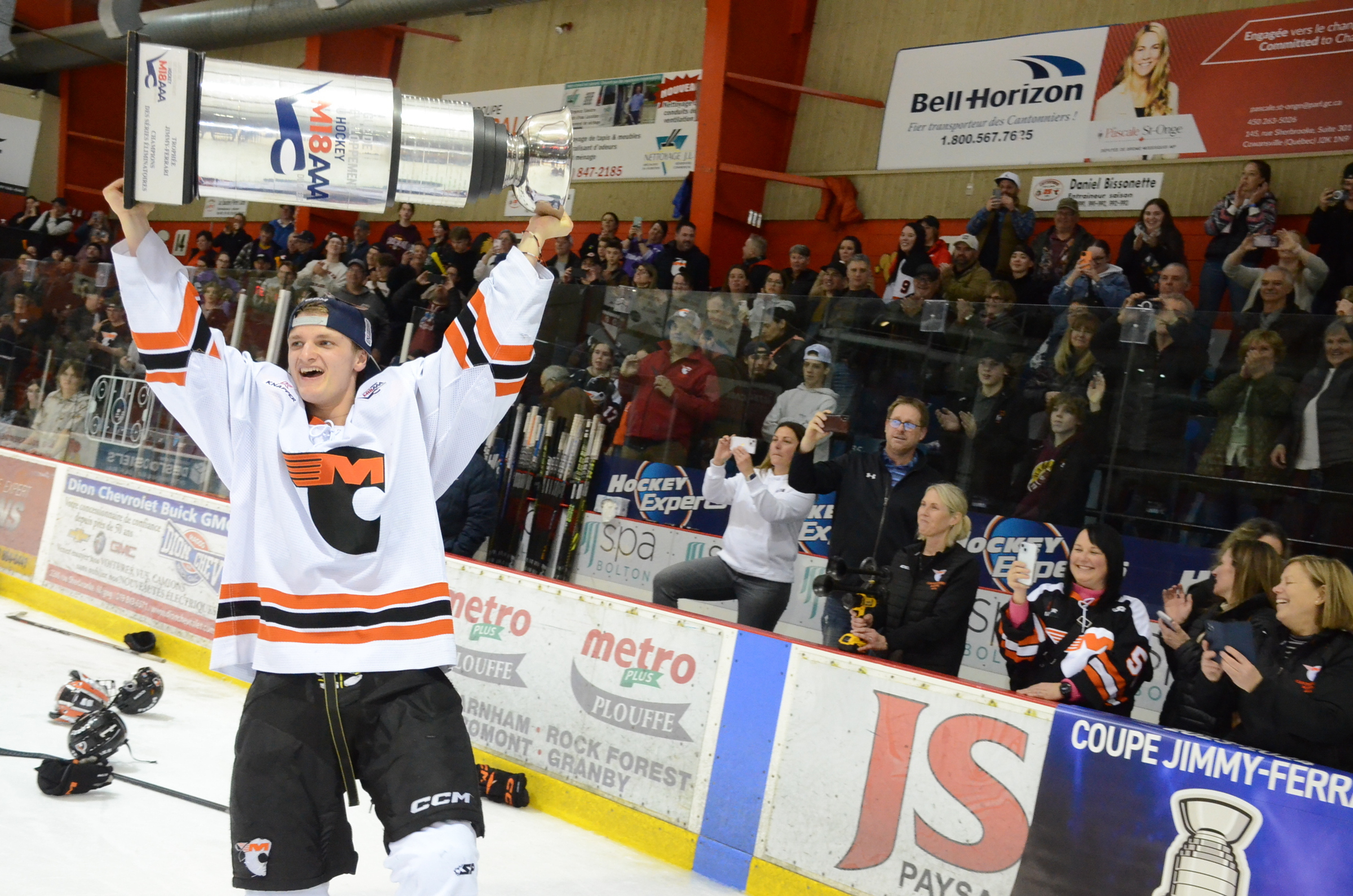 SÉRIES. Dans un match sans lendemain et devant 1500 spectateurs réunis à l’aréna de Magog, les Cantonniers ont décroché la 5e Coupe Jimmy-Ferrari de leur histoire grâce à une victoire de 2-1 en prolongation aux dépens des Estacades de Trois-Rivières, remportant ainsi la finale de la Ligue de développement du hockey M18 AAA du Québec en cinq rencontres.
