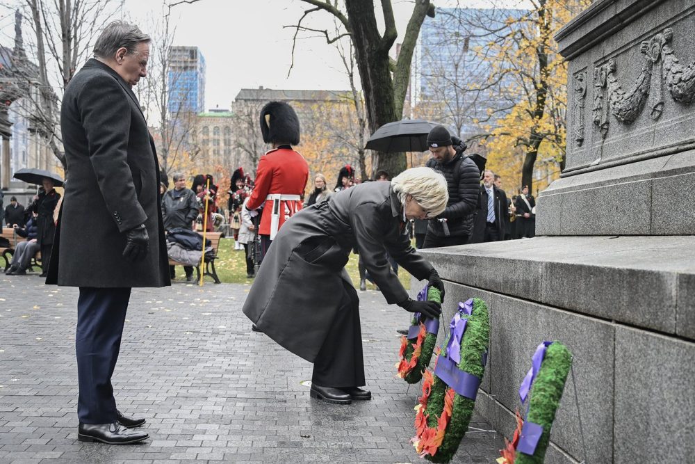 Un peu plus tôt, peu après 11 heures, des dignitaires, dont la mairesse Valérie Plante, la ministre des Affaires étrangères, Mélanie Joly, et le ministre de l’Immigration, Marc Miller, ainsi que des membres des Forces armées canadiennes ont déposé des couronnes de fleurs arborant des coquelicots rouges au pied du cénotaphe à la Place du Canada.