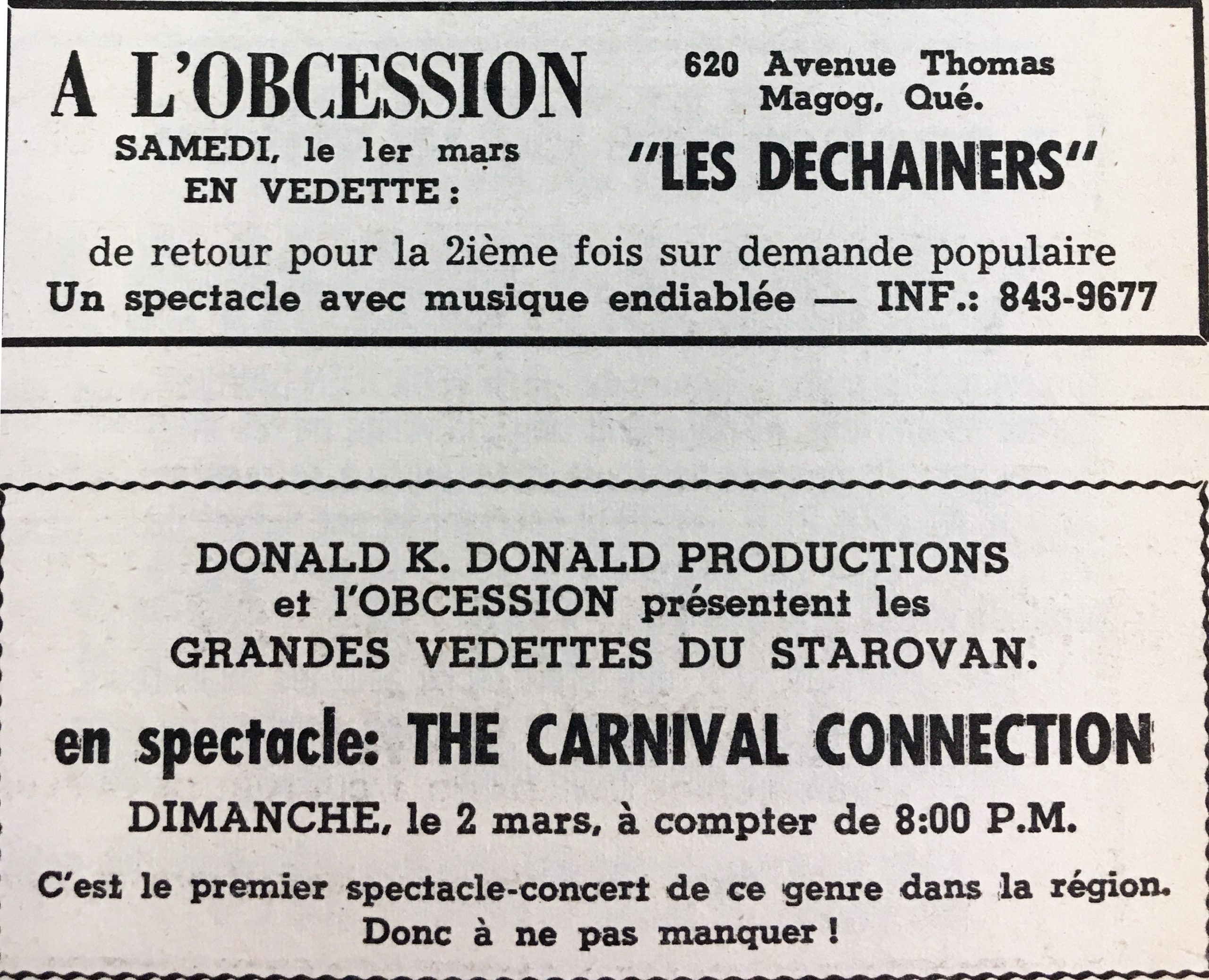 Alors que les lieux de rencontres pour la jeunesse du Québec, notamment les 15 à 20 ans, se multiplient de façon exponentielle au cours des années 1960, Magog n’échappe pas à ce phénomène. Il y a 50 ans, à l’approche des fêtes, les jeunes Magogois se dotaient d’un café-étudiant. En page 13 du journal local Le Progrès-Chronique de Magog du 4 décembre 1968, l’on annonçait que «Le café-étudiant Obcession ouvrira officiellement le 13 décembre ; les 15 à 20 ans sont les bienvenus.» Cette salle de spectacles musicaux loge au 620, rue Thomas (aujourd’hui l’Archevêque), petite rue sans issue située sur la rue Merry Sud entre l’Auberge Orford et l’Auberge du Grand Lac. Dans les années 1950, ce bâtiment avait logé le Magog Potato Chips, et en 2018 il est occupé par la Menuiserie de l’Estrie. Jean C., ex-président de la Fédération des associations générales des étudiants de Magog, (FAGEM), et Bertrand C., ex-étudiant, sont les initiateurs du projet. Présentée à une assemblée de parents-maîtres en novembre 1968, cette initiative avait été bien reçue. On y présenterait des spectacles de musique psychédélique, de chansonniers populaires et de groupes musicaux variés. Les jeunes de 15 à 20 ans pourront aussi s’adonner à la lecture, jouer aux cartes, au billard et autres jeux de société, et consommer des breuvages non alcoolisés. L’ouverture officielle a lieu le 13 décembre 1968 aux sons «fantastiques» des Topazes de Magog et avec la « musique délicieuse de la Révolution française» des Sinners, le premier groupe psychédélique québécois et l’un des tout premiers groupes de garage francophones fondé à Montréal en 1960. À l’occasion des fêtes, les parents sont invités à venir constater dans quelle ambiance leurs enfants se divertissent. Les débuts sont fulgurants. Les 27 et 28 décembre, 200 étudiants américains de Boston sont attendus. Le 27, on y danse à la musique des Fugitifs, un ensemble musical de Québec, et le lendemain c’est au tour des Carnival Connection, groupe de musique américain et vedette de Starovan, de les divertir. En janvier 1969, on y reçoit le groupe Le District Ouest, «formidable» orchestre de Montréal. En février, l’Obcession reçoit le populaire chansonnier Bobby Lee Silcott accompagné de ses quatre musiciens. En collaboration avec le comité JMC (Jeunesse musicale du Canada), on assiste à un spectacle des chansonniers suivants : Pierre Michaud de Gaspésie, Léon Arsenault de Magog, et Jean Custeau de Sherbrooke. En mars, Claude Gauthier, récemment applaudi à l’Olympia de Paris, captive un vaste auditoire. Le 29 mars, nos jeunes ont le plaisir d’entendre de nouveau le District Ouest, «l’un des plus grands orchestres psychédéliques d’Amérique du Nord». En une seule soirée, plus de 200 jeunes assistent à un spectacle. Pendant les deux premiers mois, quelque 6 000 admissions sont enregistrées, et moins de deux mois plus tard on atteint les 8 000. L’Obcession invite de nouveau les parents à venir voir leurs jeunes se divertir à l’occasion de la visite d’Oliver Claus, chanteur et guitariste rock au style de Jimi Hendrix. Dans les mois qui suivent, d’autres groupes bien connus s’y manifestent : les Déchaîners, The Influence de San Francisco, orchestre psychédélique en tournée au Canada; les Sound Box de Montréal avec leur soul électronique; les Topazes de Magog, The Peace of Mind, The Purple Haze, les Talmuds, les Sound Track, les Mercy’s, The Urge, les Doomed, les Munks, groupe psychédélique garage punk du Québec, les Haunted, les Black and Blues de Myles Clark et de nombreux autres. Même si l’Obcession était en compétition avec le Bistro du Centre des loisirs de Magog, où étaient présentés des spectacles identiques, les affaires allaient bon train. Il n’y avait cependant pas unanimité au sein de la direction sur l’orientation à donner à ce café-étudiant, à savoir sur le genre de spectacles à y produire : chansonniers populaires ou groupes musicaux célèbres, ce dernier choix gonflant les dépenses. De plus, les jeunes demandaient que l’on y introduise l’alcool. Un tel lieu de rencontre était convoité par les vendeurs de drogues à qui l’on avait refusé l’accès. Plutôt que de mettre tous ces jeunes vulnérables à la merci d’une organisation criminelle et de décevoir les parents, la direction optait pour la fermeture de l’Obcession après moins d’un an d’opération réussie. Par Maurice Langlois Membre Société d’histoire de Magog