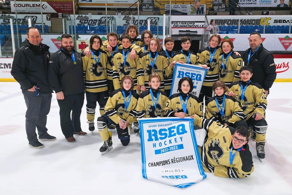 HOCKEY SCOLAIRE. Les Carnicas M14 D3 de l’école secondaire de La Ruche ont officialisé la double couronne de leur catégorie en remportant les séries éliminatoires régionales de hockey scolaire, le 5 avril dernier.