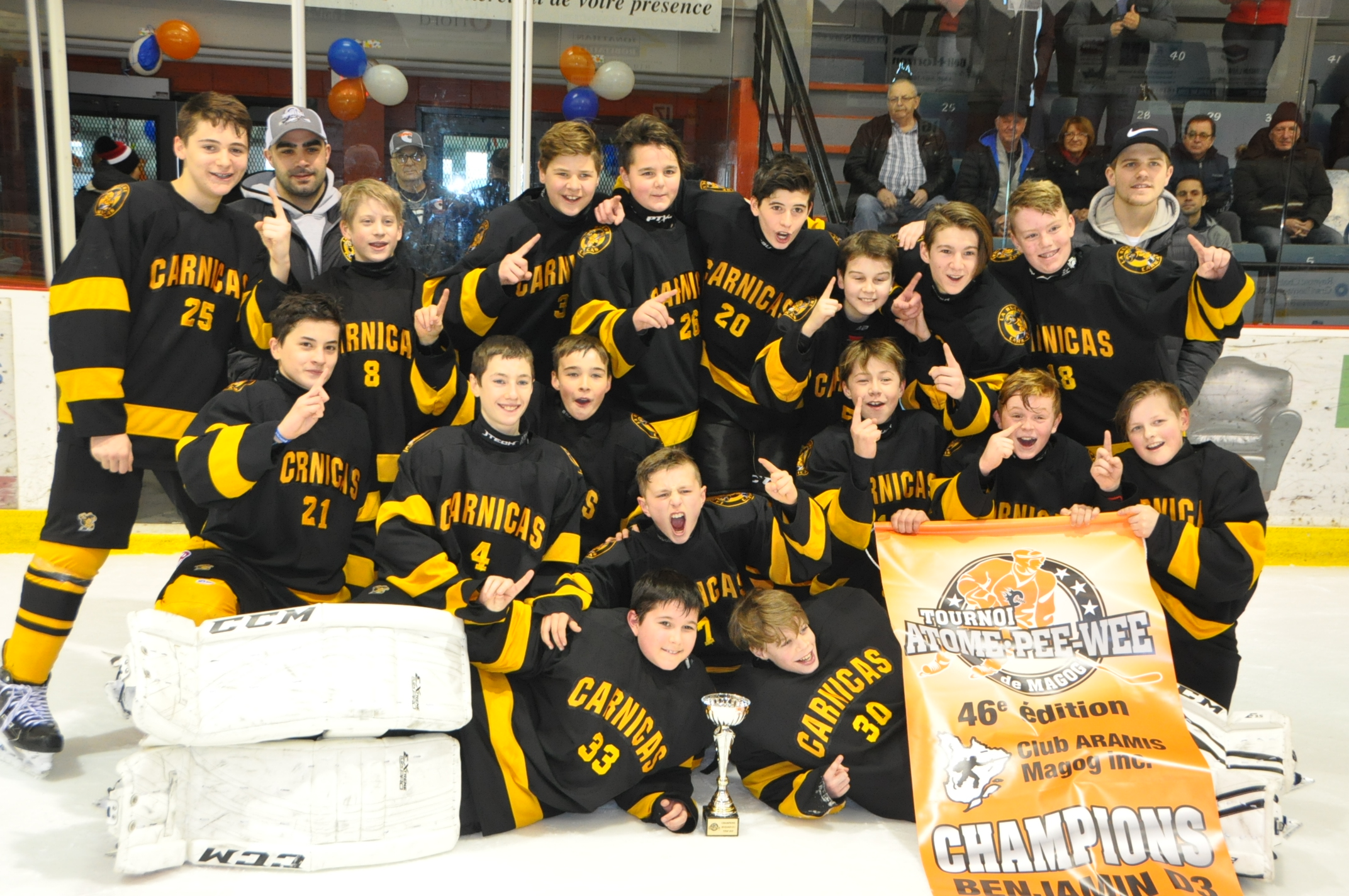 TOURNOI. Après avoir baissé pavillon (7-5) en ronde préliminaire face au Graal du Collège Claretain, les Carnicas de La Ruche ont pris leur revanche sur l’équipe des Bois-Francs en l’emportant 5-2 hier après-midi en finale du Tournoi provincial atome pee-wee de Magog, décrochant ainsi les grands honneurs de la catégorie benjamins D3. Cette finale de la classe scolaire devait préalablement être disputée dimanche dernier, mais en raison de la tempête qui sévissait sur la région cette journée-là, on avait choisi de reporter le match au 23 janvier. Il s’agit donc d’un deuxième titre à ce tournoi pour une formation locale, le premier étant l’œuvre des Cantonniers atome B-1. Le 46e Tournoi atome pee-wee se poursuit jusqu’au 27 janvier à l’aréna de Magog. Cinq finales viendront clôturer les activités ce dimanche, à compter de 14 h 30.