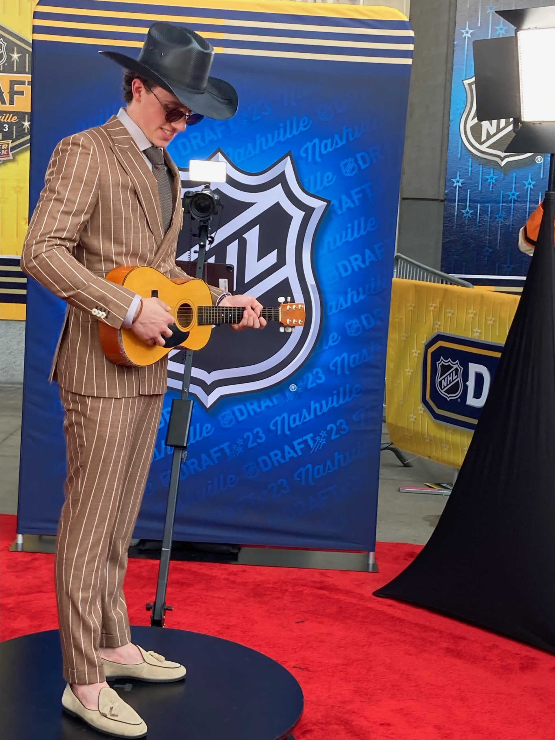 Gabriel Perreault a dû se “déguiser” en vedette country lors d’un tapis rouge précédant le repêchage à Nashville. (Photo gracieuseté)
