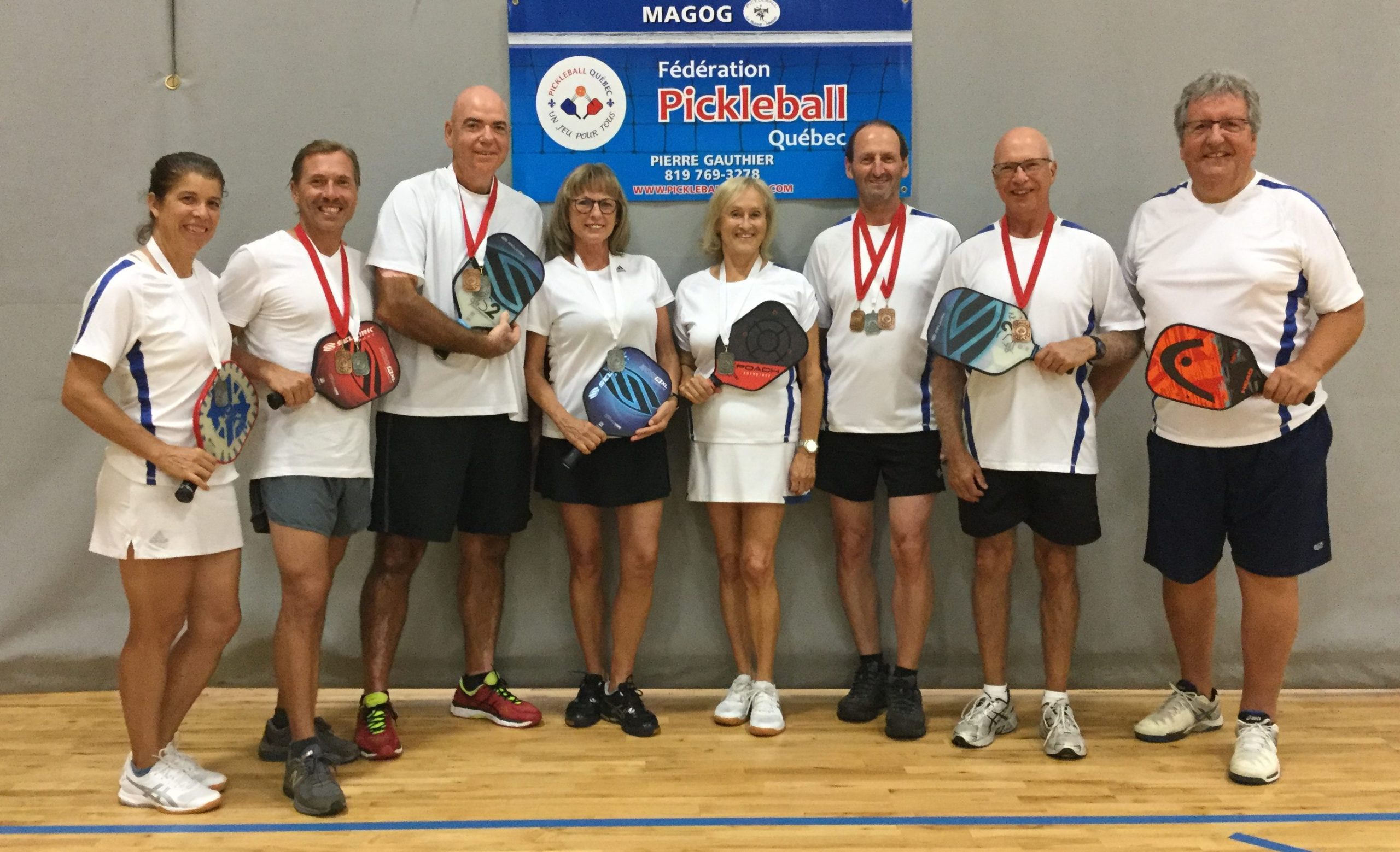 TOURNOI. Les membres du club de Pickleball La Ruche de Magog ont totalisé une dizaine de médailles lors d’un tournoi de niveau canadien, les 25 et 26 août à Laval. Yves Higgins a été le plus décoré du groupe avec trois podiums dans sa catégorie, soit une médaille d’argent en double mixte et le bronze en double homme et simple homme. Gérard Champigny (argent en double mixte et bronze en double homme) et Robert Pedneault (argent en double mixte et bronze en double homme) ont pour leur part obtenu un doublé. La récolte de médailles a été complétée par Nathalie Cyr (argent en double mixte), Suzanne Gagné (argent en double mixte), Pierrette Beaulieu (argent en double mixte) et Réjean Houde (bronze en double homme). Cette compétition venait en quelque sorte clôturer une saison estivale bien remplie pour le club de Pickleball de La Ruche, qui réunissait hebdomadairement une quarantaine de mordus. La saison d’automne reprendra le 8 septembre au Centre sportif La Ruche, avec des matches les lundi, mercredi, jeudi et samedi. Un tournoi provincial y sera aussi présenté les 6 et 7 octobre. On espère y accueillir plus de 300 joueurs.